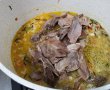 Pulpele de rață se spală și se pun la fiert în apă cu sare (eu am folosit o oală sub presiune deoarece era rață de țară și fierbea mai greu). După ce a fiert carnea, se dezosează și se desface bucăți.