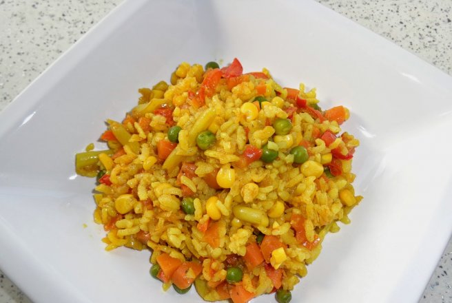 Calim usturoiul zdrobit, adaugam pe rand ceapa, ardeiul, orezul, albitura si condimentele si calim dupa fiecare. Urmeaza legumele congelate si dupa ce le-am inabusit bine adaugam supa fierbinte. Lasam sa scada pana absoarbe aproape tot lichidul. Putem sa dam si la cuptor. Ca sa nu fie prea mult lichid putem adauga supa treptat cate o ceasca pana se evapora treptat.