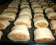 Se unge masa de lucru cu ulei, se imparte aluatul in 4 si se intind foile pe rand, cu ajutorul sucitorului. Fiecare foaie se taie de-a lungul pe jumatate, iar pe marginea taiata se pune piureul de fructe. Se ruleaza fiecare jumatate de foaie, apoi se taie in felii late de 1-2 cm. Se procedeaza asa pana cand se termina tot aluatul. "Pachetelele" se aseaza intr-o tava unsa cu ulei si tapetata cu hartie de copt si se baga la cuptor pana cand se rumenesc frumos. Dupa ce se racoresc putin, se pot pudra cu zahar.
