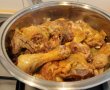 - Eu am avut pui de casa, ceea ce insemana mult mai mult timp de fierbere. Am portionat puiul si bucati potrivite si le-am marinat cu sare, piper, pasta de ardei rosu, praf de usturoi si vin alb. Am lasat la frigider cu op seara inainte.