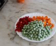 - Cand e aproape fiert adaugam morcovii taiati rondele, ardeiul taiat cubulete si mazarea.Adaugam si un chilli tocat fin. Acoperim din nou si lasam la foc domol pana legumele sunt fierte.