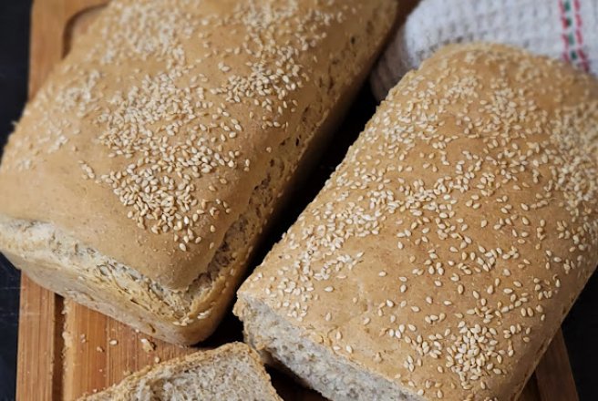 Intr-un castron cernem faina de grau, adaugam faina integrala de secara si taratele de grau. Amestecam ingredientele si facem o adancitura in mijloc. Amestecam zaharul cu drojdia, putina apa calda si 1 lingura de faina intr-un castron si turnam amestecul in centru. Lasam cateva minute pana isi mareste volumul si drojdia este activata. Punem intr-o margine sarea, turnam uleiul, restul de apa si incepem sa framantam aluatul pana nu se mai lipeste de maini.Strangem aluatul intr-o bila.  Acoperim vasul cu un prosop si il lasam sa creasca. Cand aluatul a crescut suficient il scoatem pe un blat infainat si il framantam bine. Impartim aluatul in doua parti egale, dam forma  aluatului de sul si il punem in tavi. Acoperim tavile cu un prosop si  lasam aluatul sa creasca. Cu o pensula umezim painea deasupra si presaram semintele de susan. Dam tavile la cuptorul preincalzit la foc iute 20 minute, apoi reducem focul la mediu pentru inca 30 minute. Scoatem tavile, apoi scoatem painea din tava si o lasam la racit invelita in prosop. Daca dorim  o coaja foarte crocanta punem in cuptor o tava cu apa cand pornim cuptorul sa se incalzeasca, pe care o vom scoate dupa cele 20 de minute.