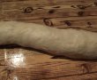 Se intinde aluatul crescut in doua foi mai subtiri, se presara peste ele mozzarella si maslinele feliate si se ruleaza strans.