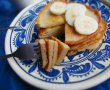 Adaugi esenta de vanilie, si lasi amestecul deoparte. Intr-o tigaie antiaderenta sau pentru clatite, pui un polonic din compozitie, o intinzi usor si prajesti clatita pe ambele parti,pana se rumeneste bine. Procedezi asa pana ce termini compozitia. Vor iesi vreo 4-5 mini-clatite. Decorezi cu feli de banana, si servesti.