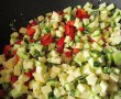 Cand pasta s-a fiert, o scurgem bine de apa si o adaugam in tigaia cu legume . Amestecam bine .