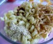 Se fierb pastele in apa cu sare conform indicatiilor de pe pachet.Eu folosesc paste "Gata" -fierb repede, isi pastreaza forma si nu se lipesc intre ele.Se strecoara de apa si se clatesc cu apa rece.