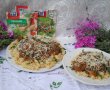 Sau adaugam sosul de rosii peste paste, cascaval ras si amestecam bine.