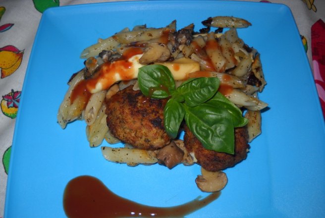 In tigaia cu ulei calim ceapa tocata foarte marunt sau data pe razatoare,ciupercile feliate,usturoiul taiat marunt iar dupa ce s-au calit bine,amestecam cu pastele fierte si scurse;