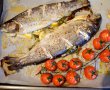 Păstrăvul, curățat și eviscerat, se unge cu ulei și pe exterior și pe interior, se presară cu sare, piper, puțin chilli, se crestează pe partea care va sta deasupra în timpul tratamentului termic, iar în crestături se va adăuga câte un cățel de usturoi strivit. În interiorul păstrăvului se adaugă ierburile aromate și câteva felii mici de lămâie. Se așază într-o tavă tapetată cu hârtie de copt, iar pe lângă el se așază crenguța de roșii cherry, frunze de busuic, rozmarin și câțiva căței de usturoi. Păstrăvul se dă la cuptor pentru 35-40 de minute la 180 de grade, sau în funcție de cuptorul fiecăruia, până este bine pătruns. Se servește cu roșiile cherry coapte, care se pot transforma într-un sos împreună cu usturoiul copt și frunze de busuioc. Să vă fie de folos!