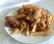 Se pun pastele la fiert in apa cu sare conform indicatiilor de pe pachet.Intr-o cratita se incinge uleiul ,se pune ceapa taiata pestisori,si se lasa sa se caleasca ,se adauga kaizerul feliute,ficatelul si ciupercile si se lasa sa se caleasca impreuna,apoi se pune apa cat sa le acopere si se lasa sa fiarba pana ce sunt fierte ingredientele si sosul scade.La sfarsit se adauga bulionul,se potrivveste gustul cu vegeta si piper si busuioc.Pastele fierte se scurg ,se trec printr-un jet de apa rece si se adauga in sos si se amesteca.