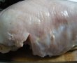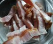 Pe fiecare bucata de piept de curcan se pun alternativ cate 1-2 fasii de cascaval, ardei, bacon, apoi se acopera cu o parte tot din carne.