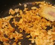 In aceeasi tigaie, fara sa aruncam eventuale urme de ulei(daca mai este nevoie mai putem adauga o lingura de ulei) se pune ceapa si usturoiul taiate cat mai marunt si se calesc, fara ca ceapa sa prinda culoare. Se amesteca ghimbirul, scortisoara, coriandrul, chimionul si curry-ul apoi se pune peste ceapa si se amesteca bine.