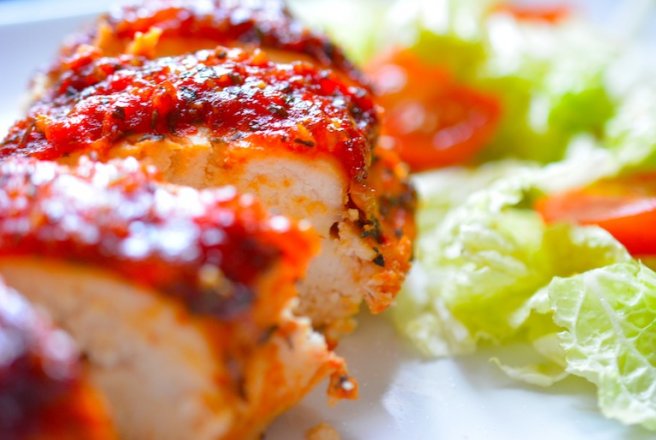 Am condimentat pieptul de pui cu busuioc uscat, sare si piper, suc de rosii, am stropit cu putin sos de soia si putin sos dulce-picant.