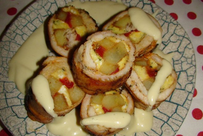 Pe foaia de carne se aseaza cartofii , omleta taiata fasii si bucatele de gogosar acru, apoi se ruleaza cu grija si se leaga nu foarte strans cu o ata mai groasa. Se pune ruloul obtinut in tava tapetata cu hartie de copt, se condimenteaza din nou si se unge cu putin ulei. Se pune in cuptorul incins si se mai intoarce cu grija din cand in cand pana se rumeneste frumos pe toate partile. Se taie cand s-a racit.
