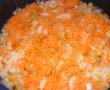 Cat se calesc legumele din tigaie, spalam si curatam dovlecelul, il taiem cubulete potrivite si il adaugam in tigaie peste celelalte legume. Cand dovlecelul s-a inmuiat adaugam orezul spalat si uniformizam amestecul.