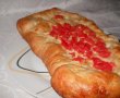 Intindem in foaie rotunda si groasa de cca 1-2 cm,ungem jumatate de foaie cu ketchup,adaugam umplutura,avand grija sa lasam cca 1-2 cm liber marginea,se pliaza cu jumatatea de aluat neacoperita cu umplutura si se ruleaza pe margine,