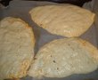 Apoi aluatul crescut l-am impartit in trei parti egale, am uns putin palmele si platoul unde am intins bucata de aluat sub forma de cerc, am uns cu ketchup si pe jumatate din aluat am pus o parte din compozitia obtinuta. Am repetat operatiunea si cu celelalte doua bucati, apoi le-am impaturit in doua si cu o furculita am apasat bine marginile. Am intepat din loc in loc cu furculita (pentru a iesi aburul format in interior), apoi le-am asezat intr-o tava unsa si tapetata cu hirtie de copt. Am dat la cuptorul incins la 180 grade si am lasat pina s-a rumenit putin, apoi am scos si am uns fiecare bucata cu o compozitie obtinuta dintr-un galbenus de ou si doua linguri de iaurt. Am mai lasat la cuptor 10 min si pizza este gata pentru a fi servita.