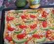 Intindem aluatul pe masa infainata, adaugam in tava (eu am tapetata cu hartie de copt) ungem blatul cu sos de rosii, adaugam cascavalul dat prin razatoare, felii de rosii, felii de avocado, felii de salam si boabe de porumb bine scurse.