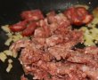 Pentru umplutura punem celee doua linguri de ulei de masline intr-o tigaie si adaugam ceapa si foaia de dafin. Lasam la prajit pana se inmoaie ceapa, apoi adaugam chorizo taiat in bucatele si carnea tocata. Amestecam bine si lasam pe foc pana carnea se rumeneste putin. Punem sare, piper, frisca lichida si ciupercile si mai amestecam de cateva ori apoi luam de pe foc si scoatem foaia de dafin.