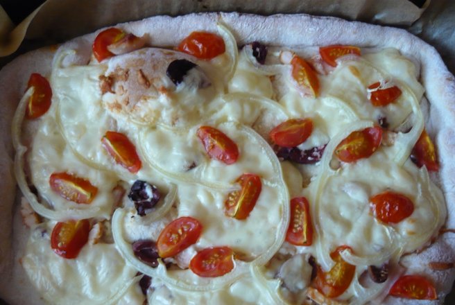 Peste aluat se pune sunca,branza rasa,maslinele,cascavalul,rosiile cherry .condimentele si ardeiul taiat feliute.