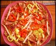 Dupa ce o scoatem o ungem cu doua linguri de branzica si doua linguri de pomodoro si adaugam ingredientele pe care le-am taiat fasii, respectiv rondele. Mai dam la cuptor pentru 10-15 minute.