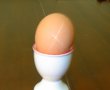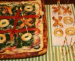 Am intalnit multi copii mofturosi care refuza sa manance peste. De aici mi-a venit ideea unui truc prin care sa ne lamurim copiii sa manance peste ascunzand-ul bine intr-un preparat si o idee inedita zic eu ar fi sa se si poata juca cu aceasta pizza in timp ce se mai racoreste un pic. Ca sa nu se raceasca prea tare pizza, putem sa le servim jocul pe jumatate dezlegat iar ei doar sa il inchida. Am propus sa fie decorata ca o tabla pe care sa poata dezlega "X si Zero". Alaturi li se servesc figurine coapte din aluat in forma de "X" si "Zero". Figurinele sunt vesel colorate: "zero" galbene de la galbenus de ou iar "X" sunt rosii, am framantat putin aluat cu pasta de ardei rosie si le-am uns cu putin Ketch-up de casa. Ca sa fie si mai distractiv, am procedat la un handmade si am colorat frumos niste scobitori cu care sa le apuce igienic. Figurinele din aluat se pot inlocui cu rondele din albus de ou fiert pentru "zero", sau rondele din ardei capia, figurinele "X" pot fi inlocuite cu baghetute taiate din ardei gras galben, variantele sunt multiple. Un truc care sper sa functioneze sa manace ton dar si verdeata. Totusi, pentru cei carora le displace profund verdeata, lasam campul galben de cascaval in schimb coloram figurinele "zero" in verde framantand putin aluat cu spanac macinat (cel congelat este perfect). Cele "X" raman rosii, avem o pizza la fel de vesela. In plus de asta, va asigur ca nu e zero la gust, n-am dat chi"X" cu nimic. Ideea jocului "X si Zero" s-a nascut intr-o dimineata cand un ou s-a spart la fiert in forma de X. Aveti poza oului mai jos.