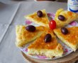 Se da tava la cuptorul preincalzit la 200 de grade pentru cca 20-25 de minute sau pana se rumeneste frumos deasupra. Se scoate din cuptor, se stropeste cu putina apa apoi se acopera cu un prosop curat de bucatarie. Se lasa acoperit cateva minute apoi se portioneaza si se serveste.