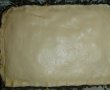 Pe masa infainata se intinde aluatul, se ruleaya si se taie in doua bucati egale. Fiecare bucata se intinde la marimea tavii in care urmeaza sa coacem placinta. Tava se unge cu ulei, se tapeteaza cu faina (eu nu am mai avut hartie de copt!) si se pune prima foaie, se aseaza umplutura uniform, apoi cea de-a doua foaie. Se da la cuptor pentru 15 minute, apoi se unge cu amestecul de oua, smantana si pasta de tomate. Se coace inca vreo 35 de minute. Cand se raceste se taie in bucati.