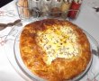 Aluatul se lasa la dezghetat. Carnea (eu am avut-o pregatita), se curata de pielite si se da prin masina de tocat sau la robotul de bucatarie. Ceapa alba curatata si tocata marunt se pune la calit in putin ulei de masline. Se adauga ceapa verde tocata rondele, se mai lasa 2-3 minute la calit, se adauga ardeiul kapia taiat feliute si baconul. Se lasa sa se caleasca toate 2-3 minte. Se adauga carnea tocata cat mai desfacuta si se amesteca cu lingura de lemn pana carnea se desface si nu sta adunata. Dupa ce zeama lasata a scazut, am turnat compozitia intr-un castron(nu aveam loc sa amestec si celelalte ingrediente), am adaugat rosiile curatate de coaja si taiate cuburi, patrunjelul tocat fin si restul de condimente dupa gust. Intr-un vas de iena uns cu unt am pus aluatul foietaj, cu marginile peste peretii vasului, am adugat umplutura si am adunat marginile. Surplusul l-am taiat cu o foarfeca de bucatarie, iar in mijloc am lasat un spatiu, nu am acoperit de tot placinta cu aluat, iar aluatul l-am uns cu putin galbenus de ou. Am dat la cuptorul incins la 180 grade pt 40 minute. Restul de ou ramas l-am amestecat cu casul si cascavalul dat pe razatoare, smantana si seminte de chimen. Am pus umplutura de branza in gaura din mijloc, am presarat deasupra seminte de chimen si am mai lasa placinta 5-10 minute la cuptor. Pofta buna!!!