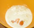 Punem faina intr-un vas si in mijlocul acesteia adaugam laptele in care am dizolvat drojdia, uleiul, ouale si sarea.