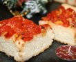 Asamblare : aluat - rosiile taiate - usturoiul feliute (eu l-am dat prin presa de usturoi) - 2 lg ulei stropim pe deasupra. Dam la foc cam 40 de minute