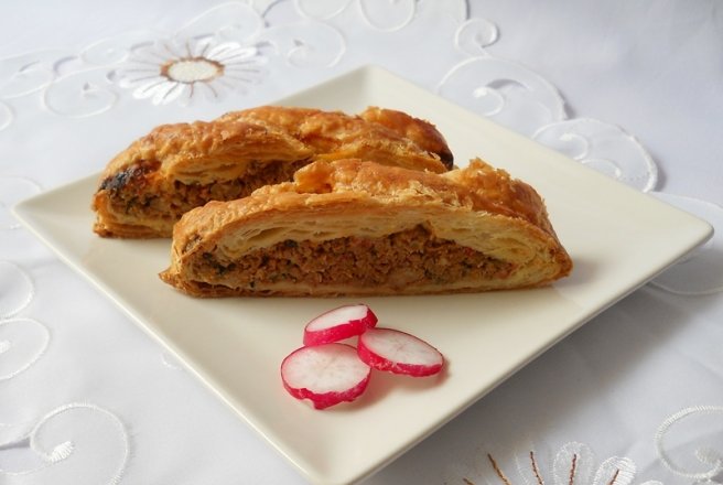 Presaram faina pe masa de lucru si asezam foietajul pe care il mai intindem foarte putin cu sucitorul. Impartim aluatul in 3 fasii pe lungime dar nu il taiati, ori din ochi faceti asta ori trasati doua dungulite subtirele cu un cutit. Partea de sus si de jos le taiem in fasii de circa 2 cm pe latime. Asezam compozitia de carne pe fasia din mijloc, apoi impletim fasiile laterale si acoperim bine capetele.