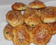 Se pune in tava tapetata cu hartie de copt, se unge cu galbenus de ou si se presara deasupra amestec de seminte. Se da la cuptorul preincalzit pentru 25-30 de minute. Se procedeaza la fel si pentru celelalte placinte. Din aceasta compozitie mi-au iesit aprox. 18 bucati. Se pot umple cu ce doriti dvs., eu am facut 10 bucati cu salam si restul cu urda proaspata de vaci.