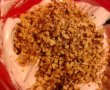 Blatul de bezea: Se bat albusurile spuma cu un praf de sare. Se adauga pe rand zaharul si zaharul vanilat mixand bine pana obtinem o spuma tare. Se pun cele doua linguri de faina apoi nuca prajita si taiata marunt. Se toarna compozitia in aceeasi tava, unsa cu putin ulei si tapetata cu hartie de copt. Se da la cuptor la 180 de grade pentru cca 25-30 minute. Se lasa blatul sa se raceasca in tava.