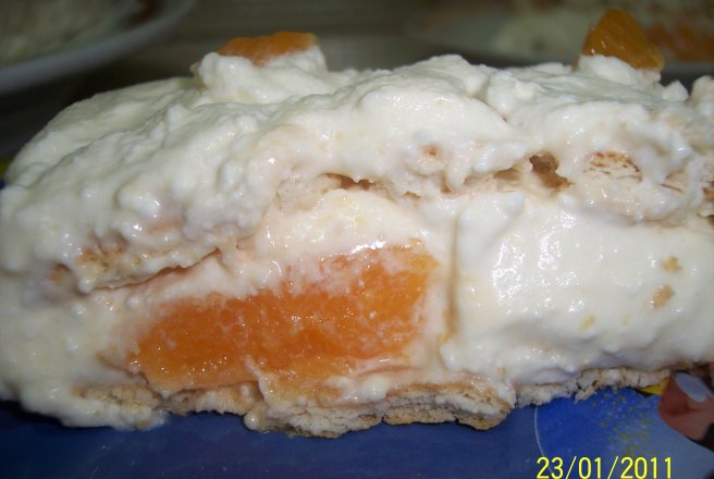 Intr-un vas dreptunghiular se pune folie alimentara si apoi un rand de biscuiti. Deasupra se pune crema, apoi felii de clementine, iar crema, biscuiti si deasupra crema. Am ornat cu bucatele de clementine si am dat la frigider pt. cateva ore.