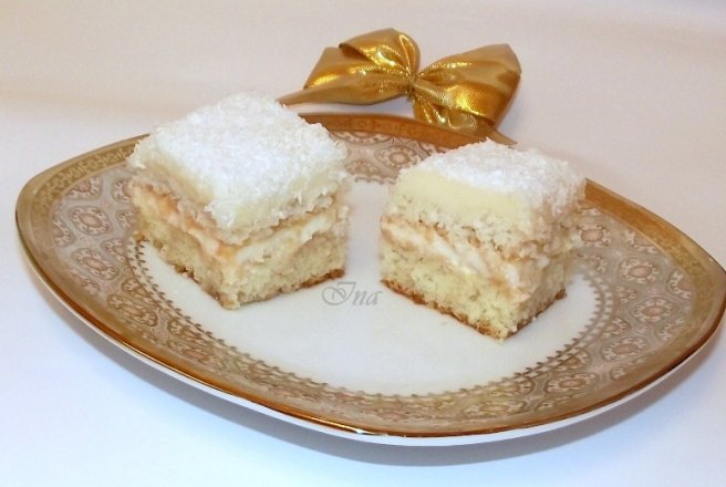 Blat 2:   Albusurile se bat spuma cu un praf de sare, apoi cu zaharul. Se adauga nuca de cocos, faina amestecata cu praful de copt, esenta de migdale sau vanilie. Turnam  compozitia in tava captusita cu hartie de copt si coacem la foc potrivit  20-25 min.