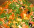 Se adauga un pahar cu apa si se lasa la fiert 20-25 minute, acoperit, la foc mediu. Cand prazul este aproape facut punem rosiile cubulete si maslinele si mai lasam pana se intrepatrund.
