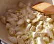 Adaugam pe rand: ceapa taiata rondele, ardeiul tocat bucatele, dovlecelul taiat cubulete si rosia decojita taiata cubulete.