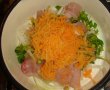 Cand carnita e gata se adauga rosiile curatate de coaja si taiate feliute, pasta de tomate desfacuta in putina apa, mustarul, sare, piper si verdeata tocata marunt. Se lasa cam 10 - 15 minute la foc mic ca sa scada sosul.