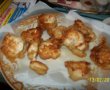 Pieptul de pui se taie in fasii potrivite de grosime si bucatile se vor da prin ou, sare, piper si faina si se vor praji in ulei in alta tigaie; dupa ce acestea sunt prajite se scot pe servetele absorbante pentru indepartarea surplusului de grasime.