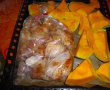 Se introduc pulpele in "punga magica" , pe care o intepi din loc in loc cu o scobitoare . Asezi punga cu pulpele langa feliile de dovleac si dai la cuptor pentru 90 de minute.
