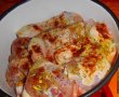 Pulpele de pui se spala si se portioneaza, dupa care se condimenteaza si se lasa cca 30 minute.
