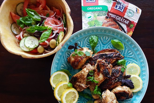 Se serveste puiul fraged impreuna cu felii de lamaie, frunze proaspete de busuioc si oregano si salata.