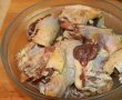 - Transati puiul in bucati potrivite ; le puteti condimenta in prealabil cu sare, piper, lamaie, usturoi si putin vin alb si il puteti tine o zi la frigider.