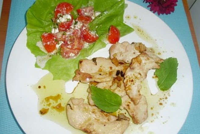 4. Cand este rumenit, pieptul de pui se scoate de la cuptor si se aseaza langa salata verde, presarand totodata si catevav frunze de menta proaspata...
