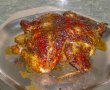 Intr-un castron se unge puiul bine cu amestecul de condimente pe toate partile si in interior, se acopera cu folie si se pune in frigider pentru cateva ore.
