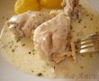 Taiem pulpele pe jumatate si le rumenim in untul incins. Adaugam apoi ceapa taiata marunt si mai intorcem pulpele o data.