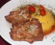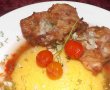 Aranjam ca in imaginea alaturata, punem saramura intr-o farfurie adanca, adaugam mamaliga, pulpele si decoram cu rosiile cherry si marar.