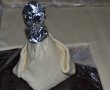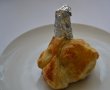 Intr-un astfel de patrat am pus un pat de ciupercute si am urcat foietajul peste pulpita. Am legat cu staniol partea de sus a foietajului pe pulpa (vezi pozele)