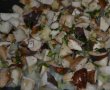 Am pregatit apoi umplutura. Ceapa se taie marunt si se pune la calit. Se adauga hribii, usturoiul si mararul. Asezonam cu sare si piper.